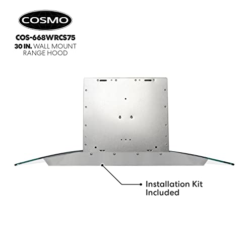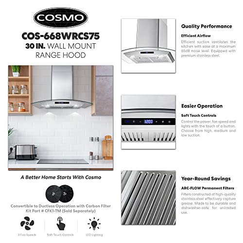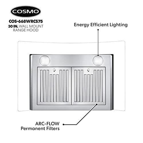 Cosmo 668WRCS75 Wall Mount Range Hood with Ducted Exhaust Vent, 3 Speed Fan, Soft Touch Controls, Tempered Glass, Permanent Filters in Stainless Steel, 30 inches