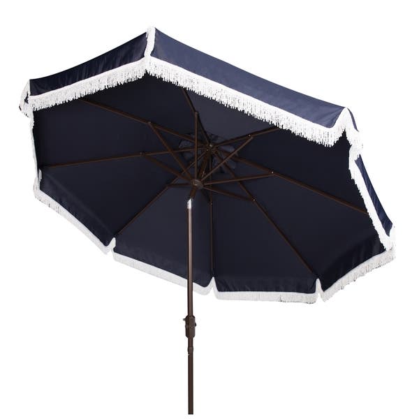 SAFAVIEH Milan Fringe 9 Ft Crank Navy/ White Outdoor Umbrella