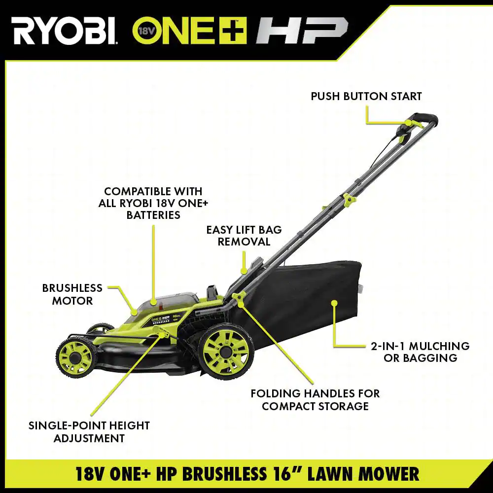 Ryobi ONE+ HP 18V Brushless 16 in. Cordless Battery Walk Behind Push Lawn Mower with (2) 4.0 Ah Batteries and (1) Charger