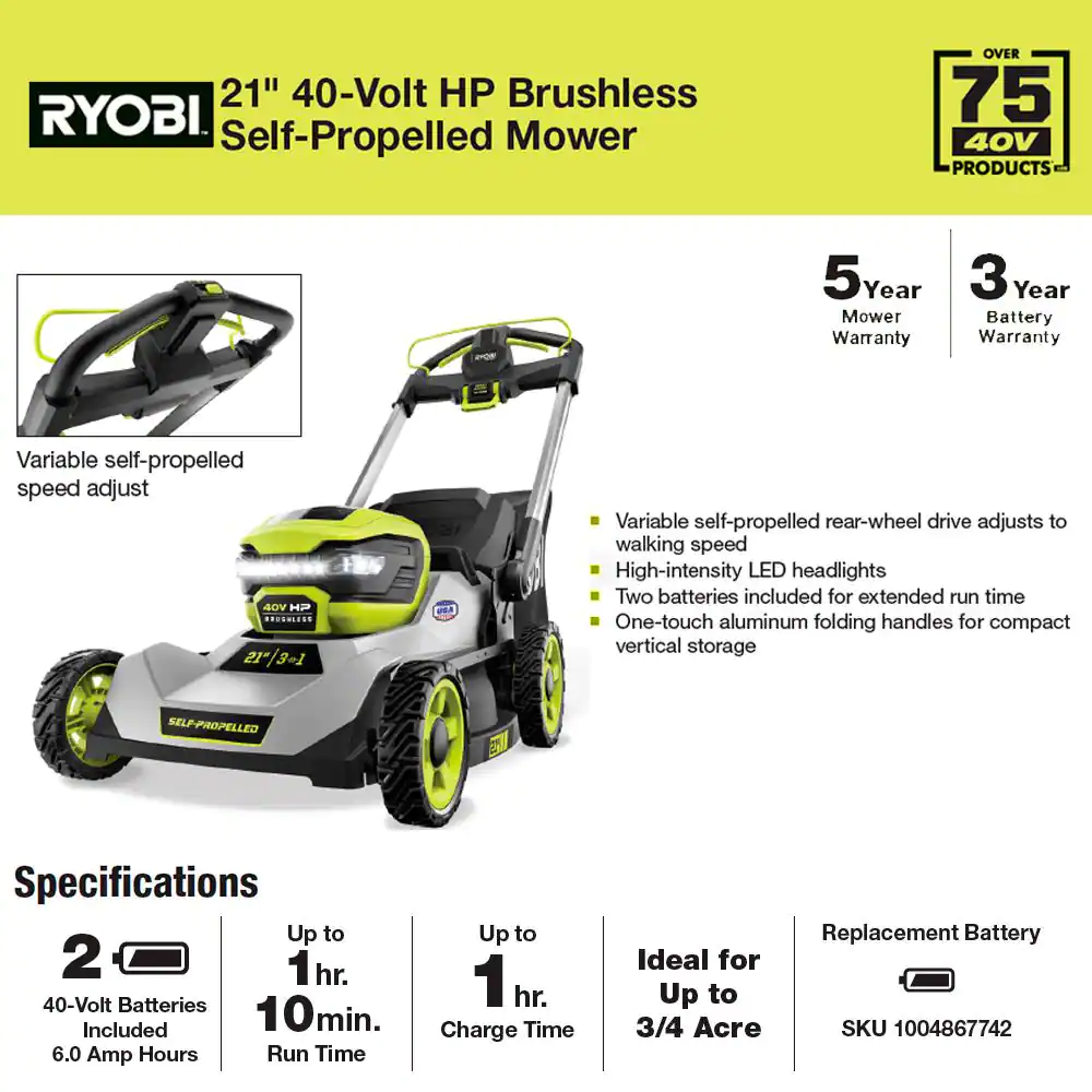 Ryobi 40V HP Brushless 21 in. Cordless Battery Walk Behind Self-Propelled Lawn Mower with (2) 6.0 Ah Batteries and Charger