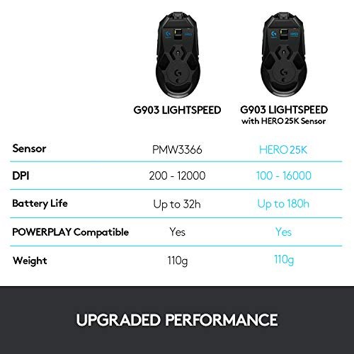 Logitech G903 LIGHTSPEED Wireless Gaming Mouse W/ Hero 25K Sensor, PowerPlay Compatible, 140+ Hour with Rechargeable Battery and Lightsync RGB, Ambidextrous, 107G+10G optional, 25,600 DPI, Black