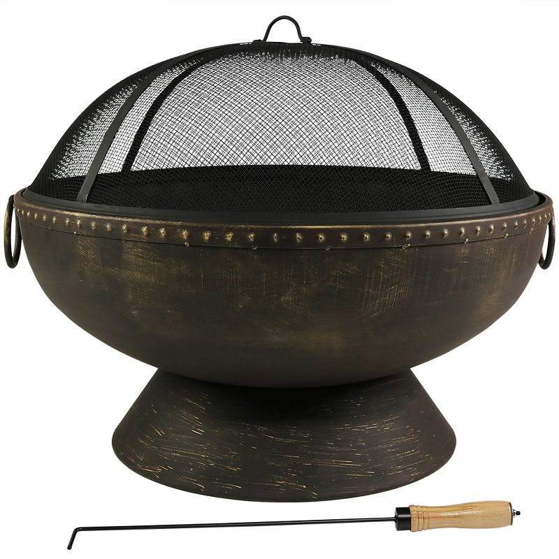 Sunnydaze Outdoor Camping or Backyard Large Fire Pit Bowl with Spark Screen, Log Poker, and Metal Wood Grate – 30″ – Bronze